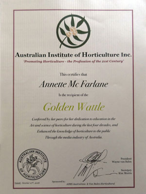 the Australian Gold Laurel for Horticulture (2018) and inducted into the